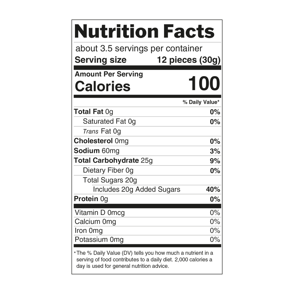 Organic Rice Syrup, Organic Cane Sugar, Water, Pectin, Citric Acid, Hydrolyzed Pea Protein, Colored with Fruit and Vegetable Juice, Natural Raspberry Flavor, Natural Cherry Flavor, Sodium Citrate, Organic Sunflower Oil, Organic Carnauba Wax.